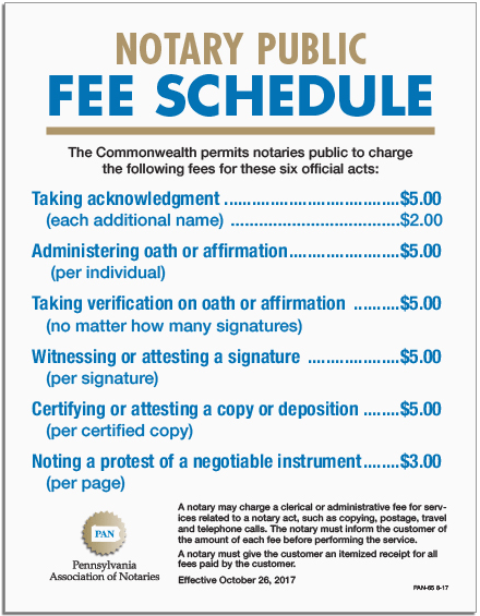 All Notarial acts will be charged the fee permitted by the Commonwealth (This does not include clerical or administrative fees listed for additional services)